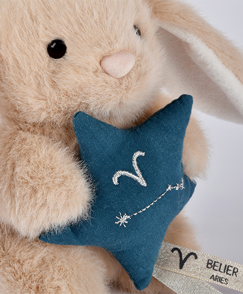 Le Doudou Astro Bélier est un compagnon tout doux imaginé pour accompagner bébé avec tendresse. Inspiré de son signe astrologique, il tient une petite étoile molletonnée brodée de la constellation du Bélier, apportant une touche poétique et symbolique.