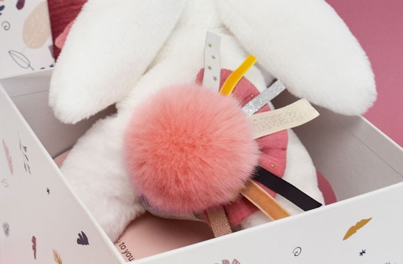 Pour ses 20 ans, Doudou et Compagnie a choisi de mettre à l’honneur l’un de ses Doudous les plus iconiques : le lapin Bonbon. Souvenez-vous, un lapin au gonflant naturel, à la douceur inégalée et au petit pompon coloré ! Aujourd’hui, ce dernier est agrémenté d’un feu d’artifice d’étiquettes et de matières langes que bébé va adorer manipuler.