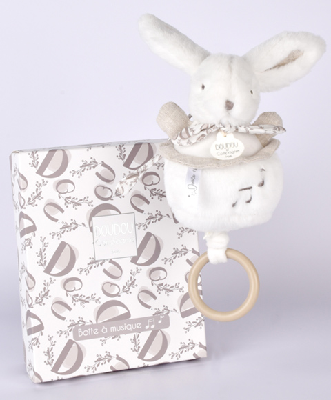 • Un lapin musical DOUDOU® blanc de 20 cm, qui diffuse une mélodie apaisante pour accompagner bébé vers le sommeil.