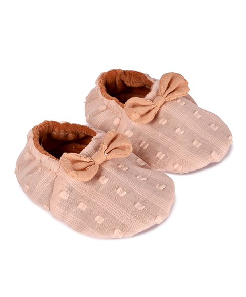 Le doudou propose différentes matières à découvrir, une collerette souple ainsi que de délicates nouettes et broderies qui invitent les petites mains à explorer en douceur. Les chaussons, confectionnés en tissu plumetis de coton et ornés d’un joli nœud, offrent confort et chaleur grâce à leur intérieur moelleux.