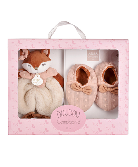 Ce coffret naissance Mina réunit un doudou renard de 18 cm et une paire de chaussons assortis pour composer un ensemble harmonieux et raffiné.