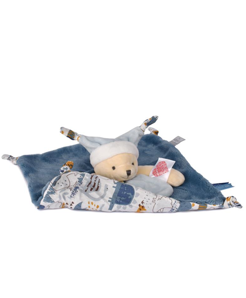 Pour appréhender sereinement le dodo, rien de tel qu'un rituel avec Doudou avant de se coucher. Ce Doudou Bleu a la particularité d'avoir un grand bonnet de nuit qui se replie sur ses yeux quand vient l'heure de se dire "Bonne nuit"! Aussi, il est composé d'une étiquette avec un QR code coeur qui permet de flasher une histoire à conter. Grand nombre de détails, étiquettes, nouettes sont à manipuler. Ainsi, il présente les fonctions idéales pour favoriser son endormissement.