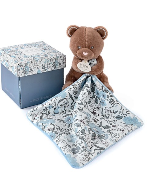 • Doudou présenté dans une boîte fleur suprise, on peut y insérer des souvenirs de bébé ! (photos, souvenirs de la naissance de bébé)
