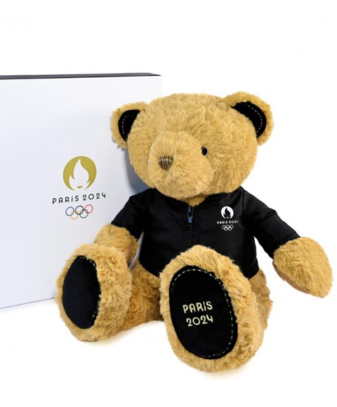 Amoureux des ours en peluche, voici l'ours en peluche premium marron de Paris 2024 ! Habillé d'une veste noire, il affiche une élégance décontractée chic et sport !