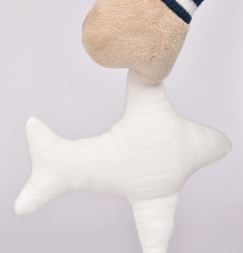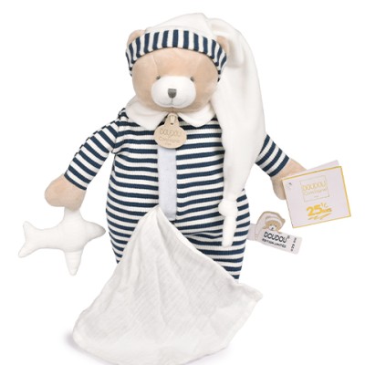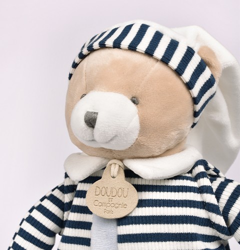 Modèle iconique, réédité avec son petit avion et son lange blanc à glisser dans la poche de son pyjama rayé.