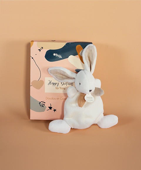 Ce petit Doudou lapin HAPPY beige "Happy Wild" est extrêmement doux et tendre. Adorable avec son pompon couleur lin clair, ainsi que ses touches de lange sable et naturel, il est blotti dans une superbe boîte cadeau aux graphismes évoquant à la fois la modernité et le luxe, tel un écrin magique. Ce doudou petit format est à adopter de toute urgence !