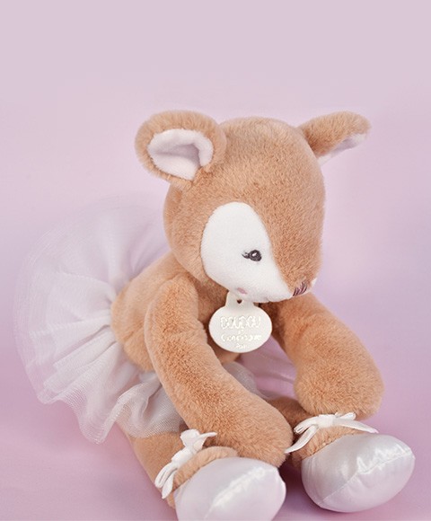 Cette peluche faon, toute douce, est vêtue d'un tutu en tulle et de chaussons de danse en satin décorés d'un noeud en velours, Raffinée et séduisante, elle est présentée dans une jolie boîte cadeau au décor assorti,