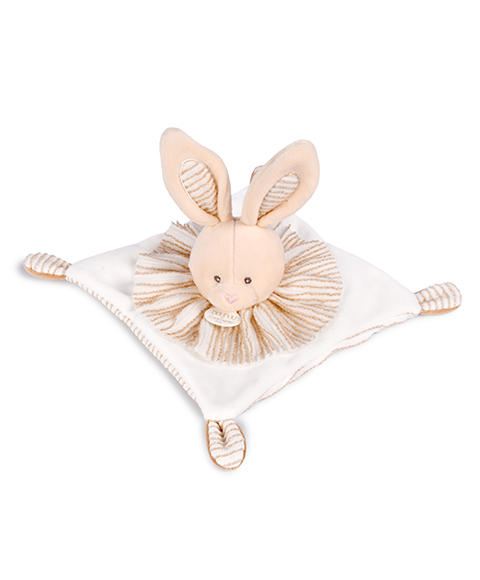 Son format plat et souple en fait un doudou idéal pour les premiers câlins, facile à manipuler et à emporter partout. Sa collerette en matière voile écrue et beige, délicatement rayée, apporte une touche sensorielle tout en douceur. Elle est spécialement conçue pour retenir les odeurs familières et aider bébé à se sentir en sécurité.