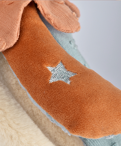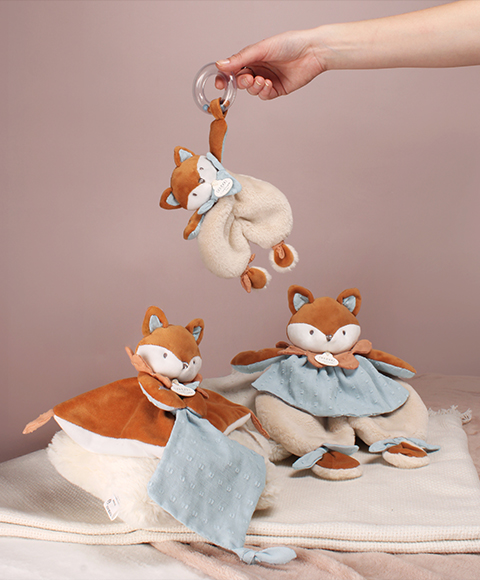 Le doudou renard Timo séduit par la richesse de ses matières et la finesse de ses détails. Ses textures variées, sa collerette souple et ses nouettes offrent différentes prises adaptées aux petites mains, favorisant la manipulation et l’exploration tactile.